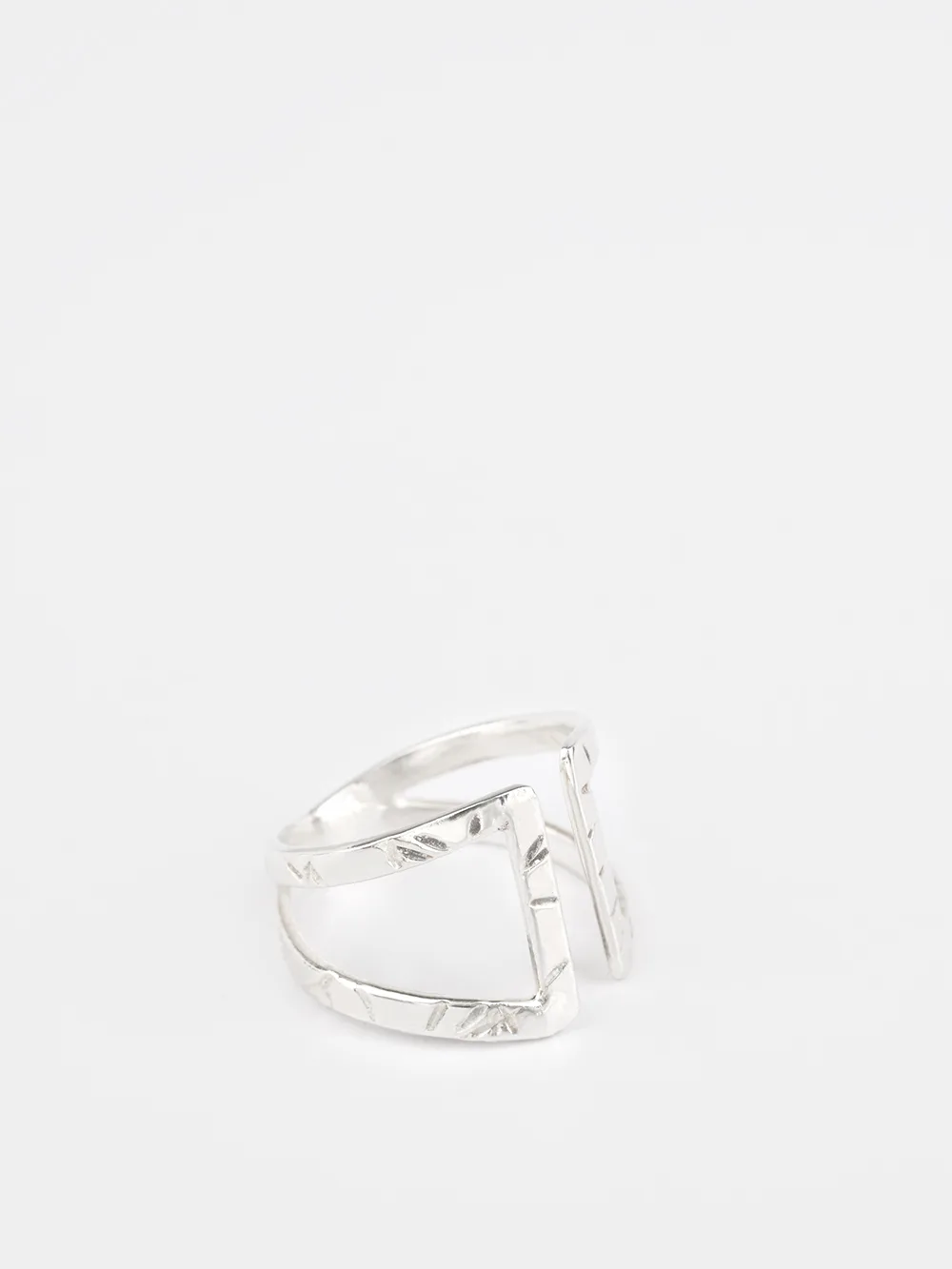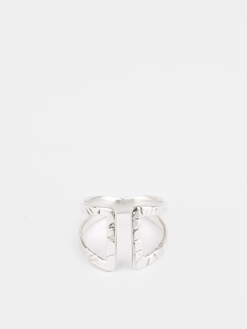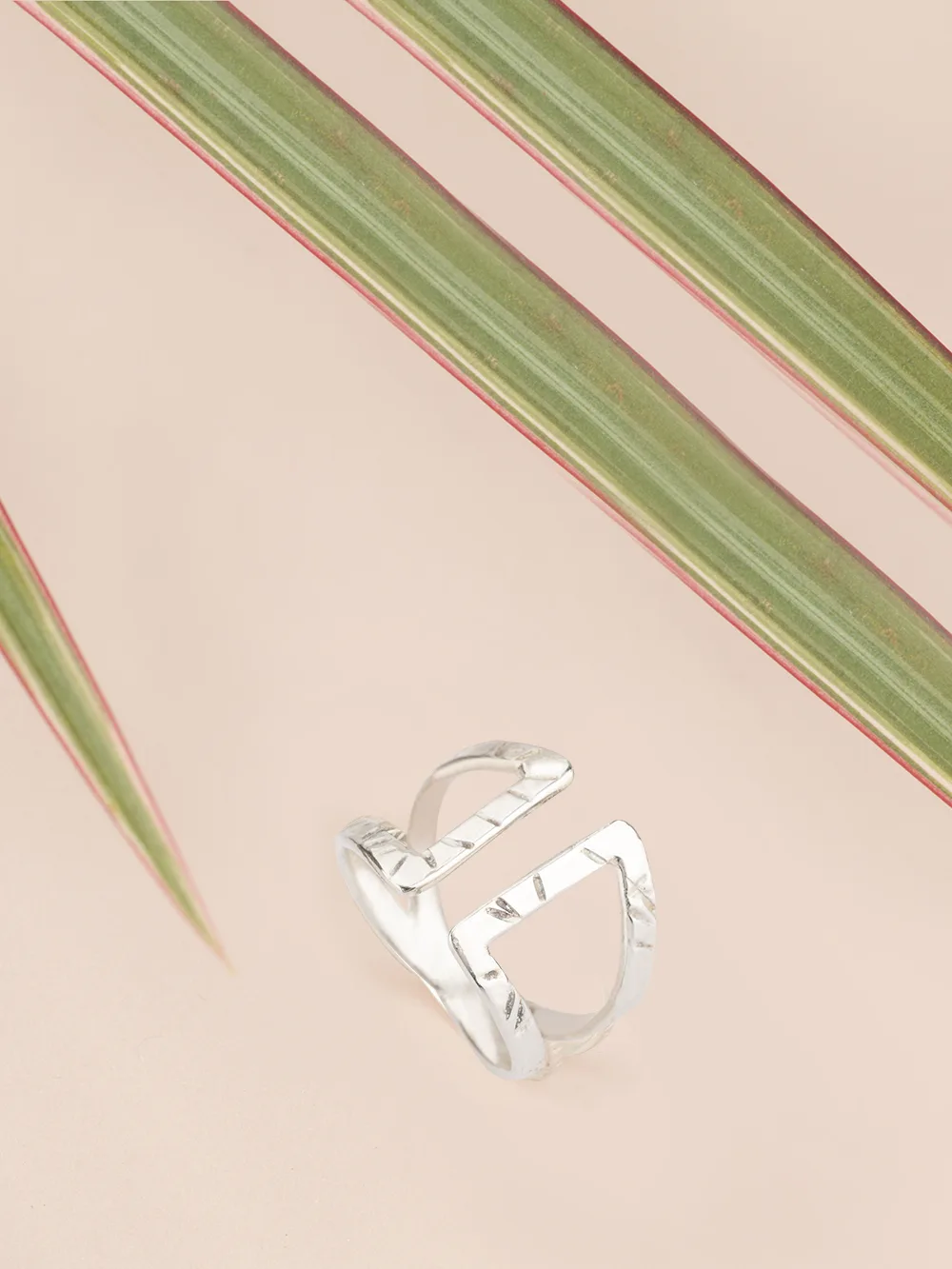 Anillo de plata de ley 925, de líneas cruzadas, hecho con la técnica martelé. De la colección BCN.