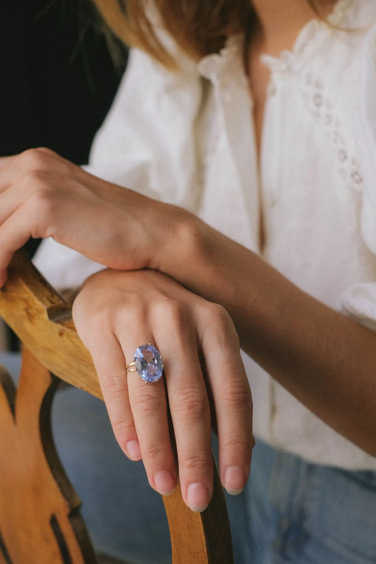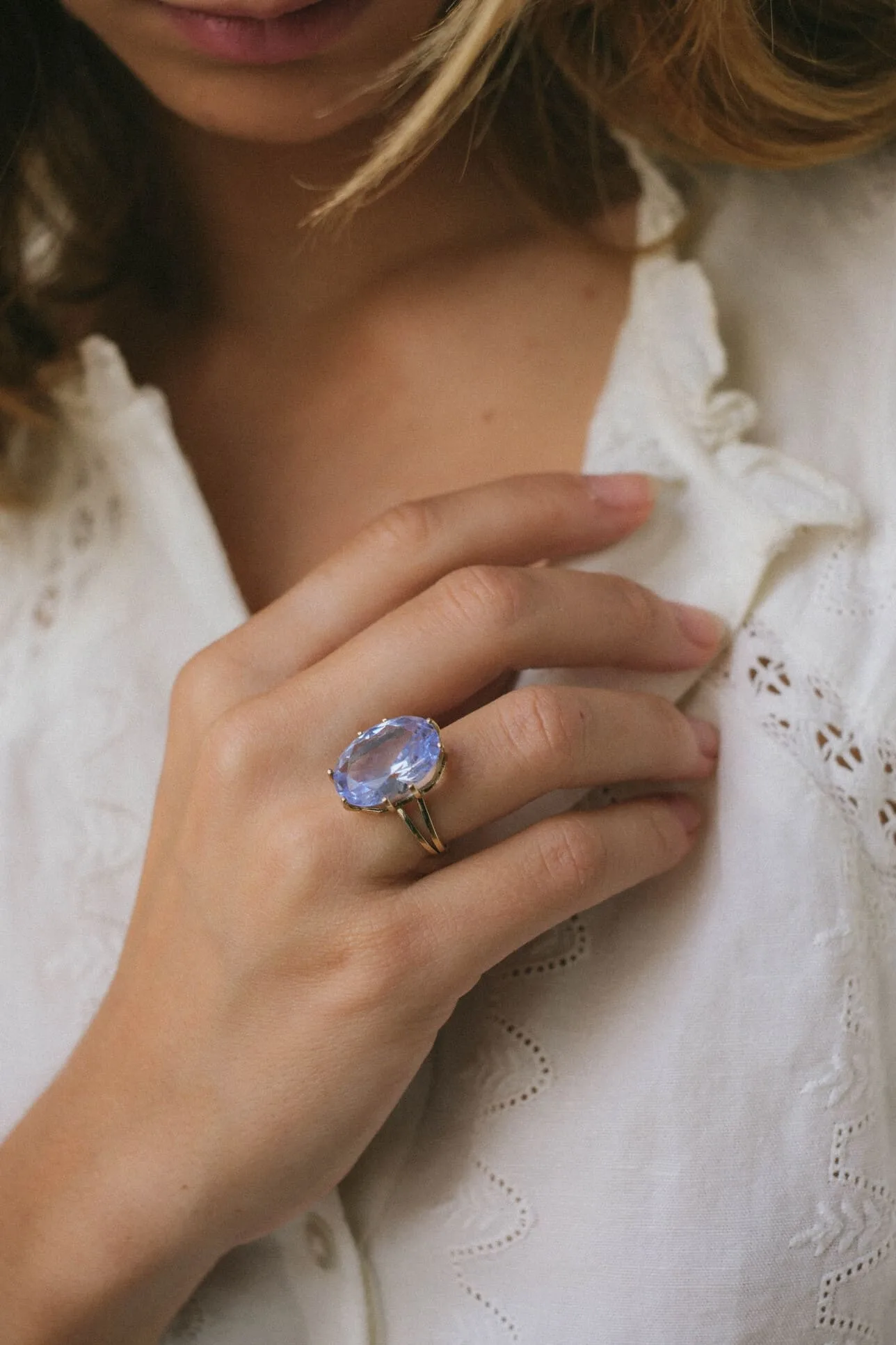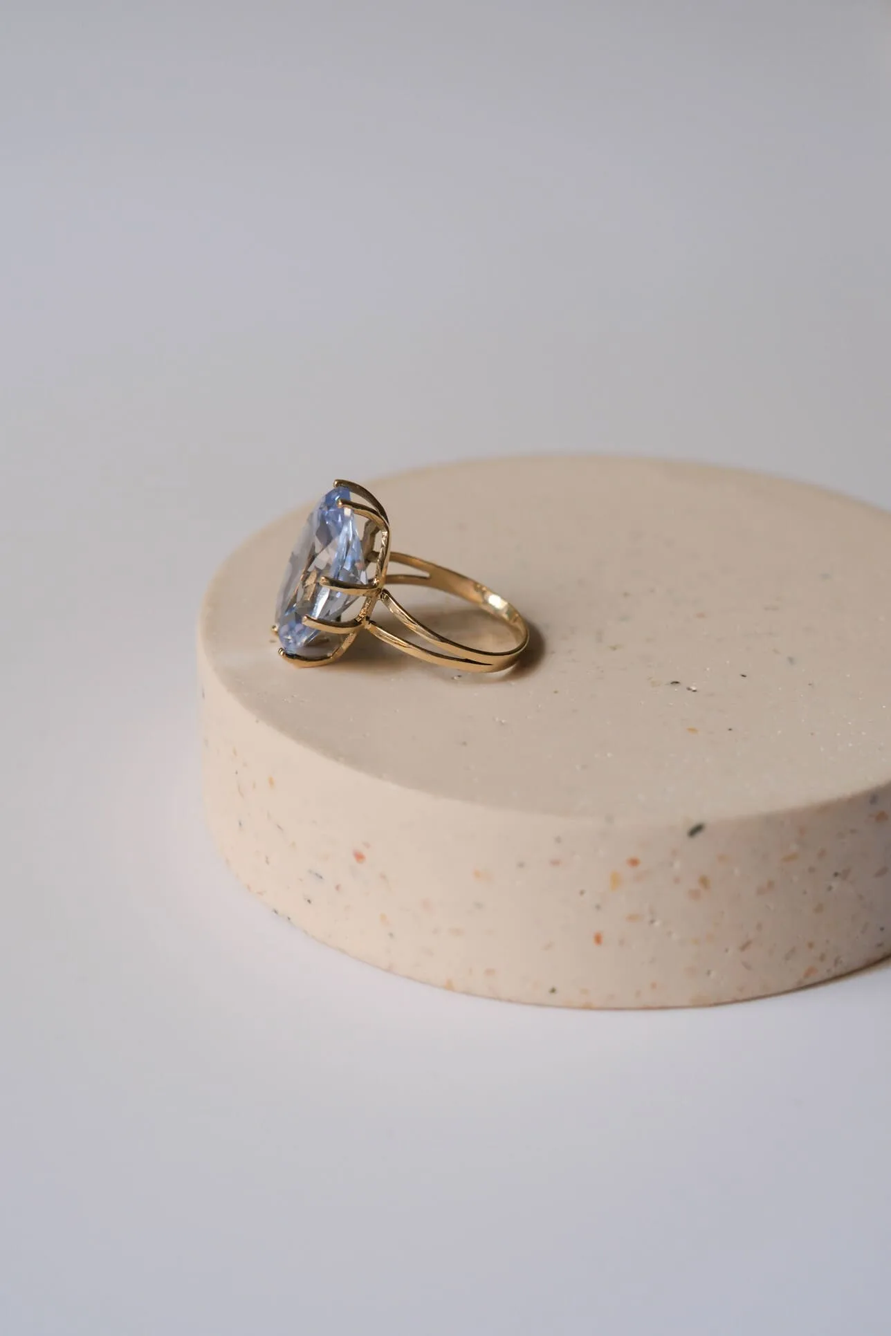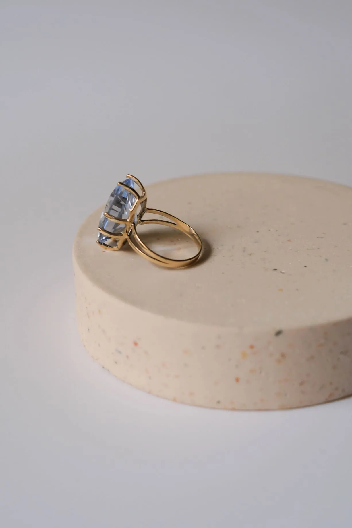 Anillo de oro de 9 k con una piedra aguamarina sintética ovalada. Medida piedra: 18 x 14 mm.