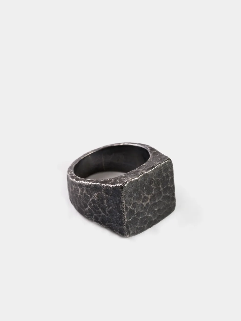 Anillo de plata de ley 925 oxidada, en forma de sello, hecho con la técnica martelé y acabado redondeado.