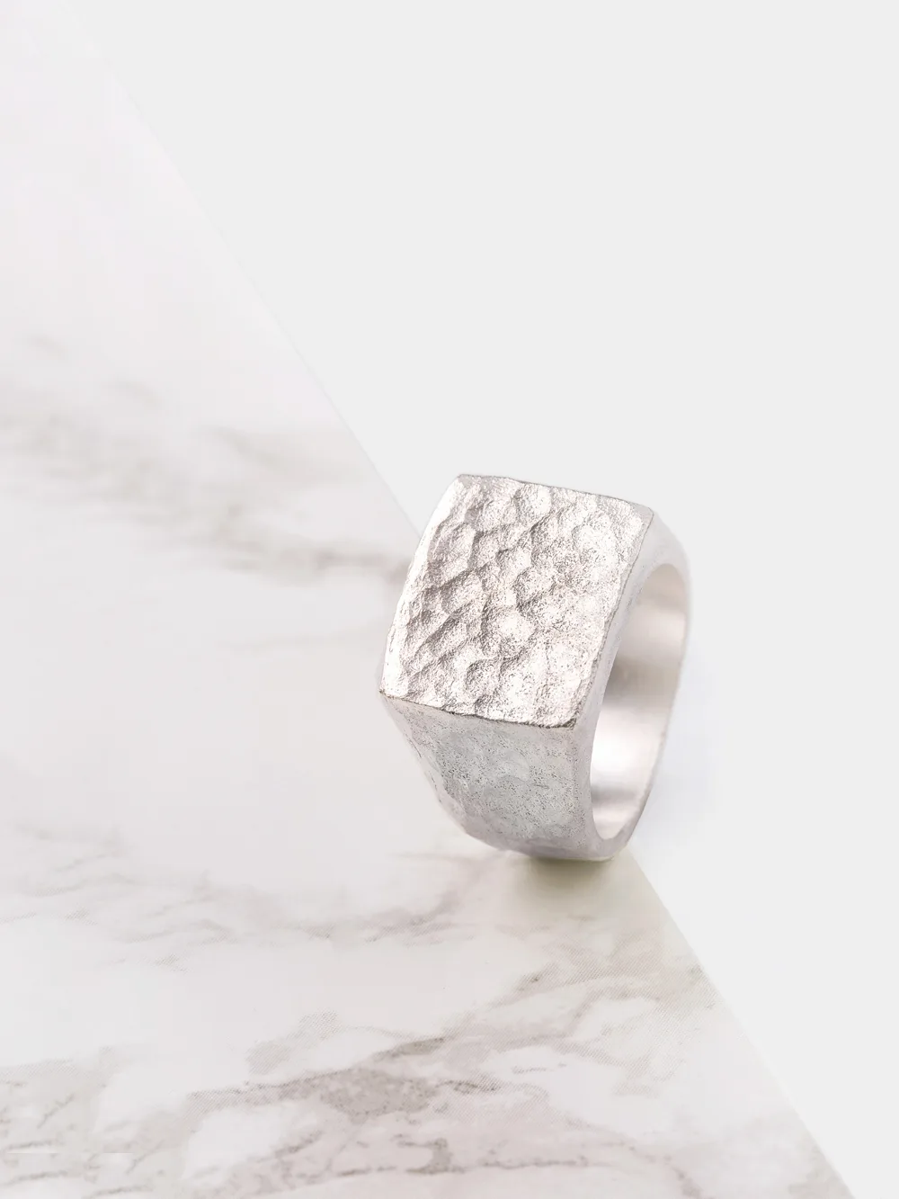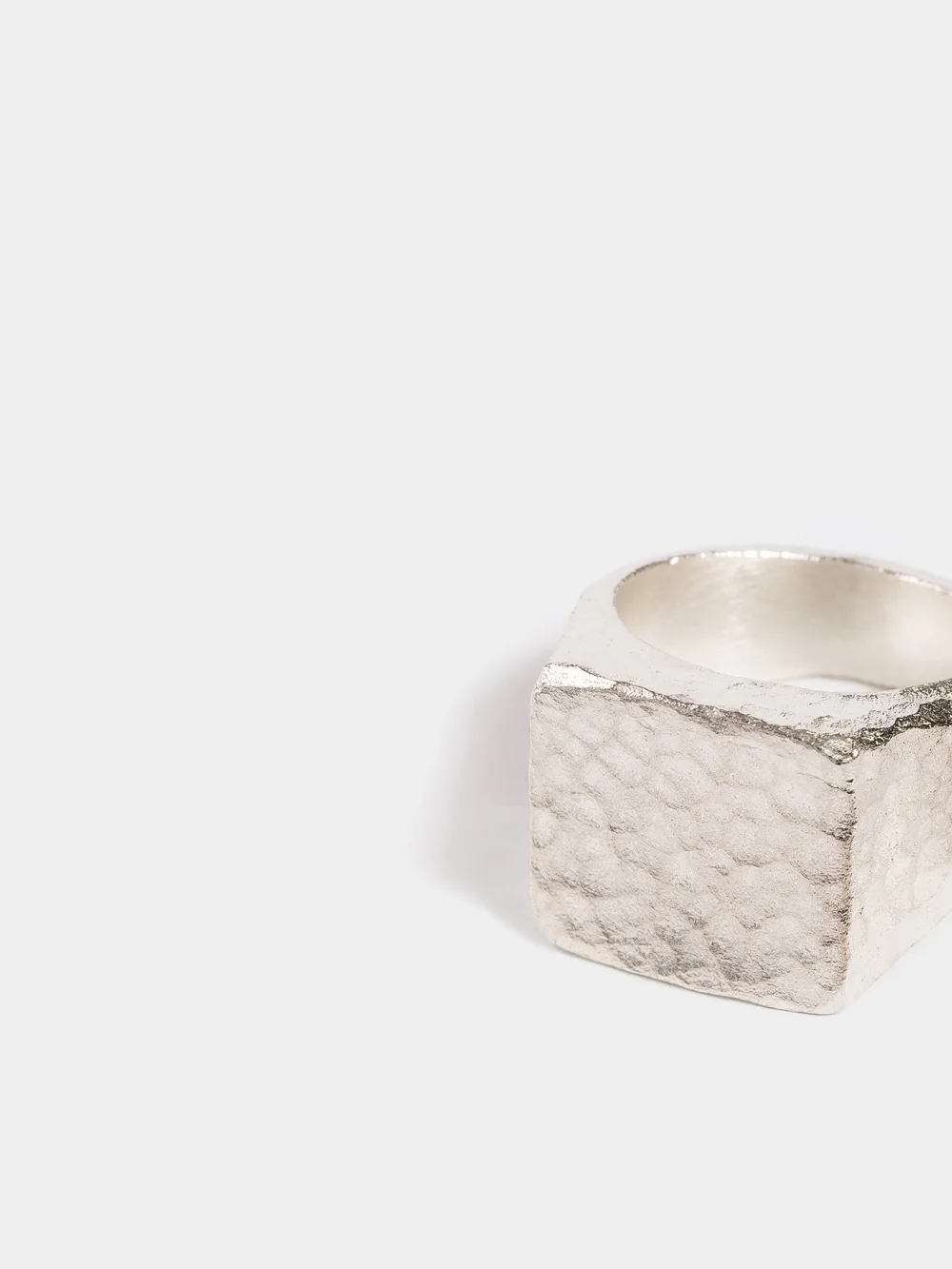 Anillo de plata de ley 925 en forma de sello, hecho con la técnica martelé y acabado redondeado.