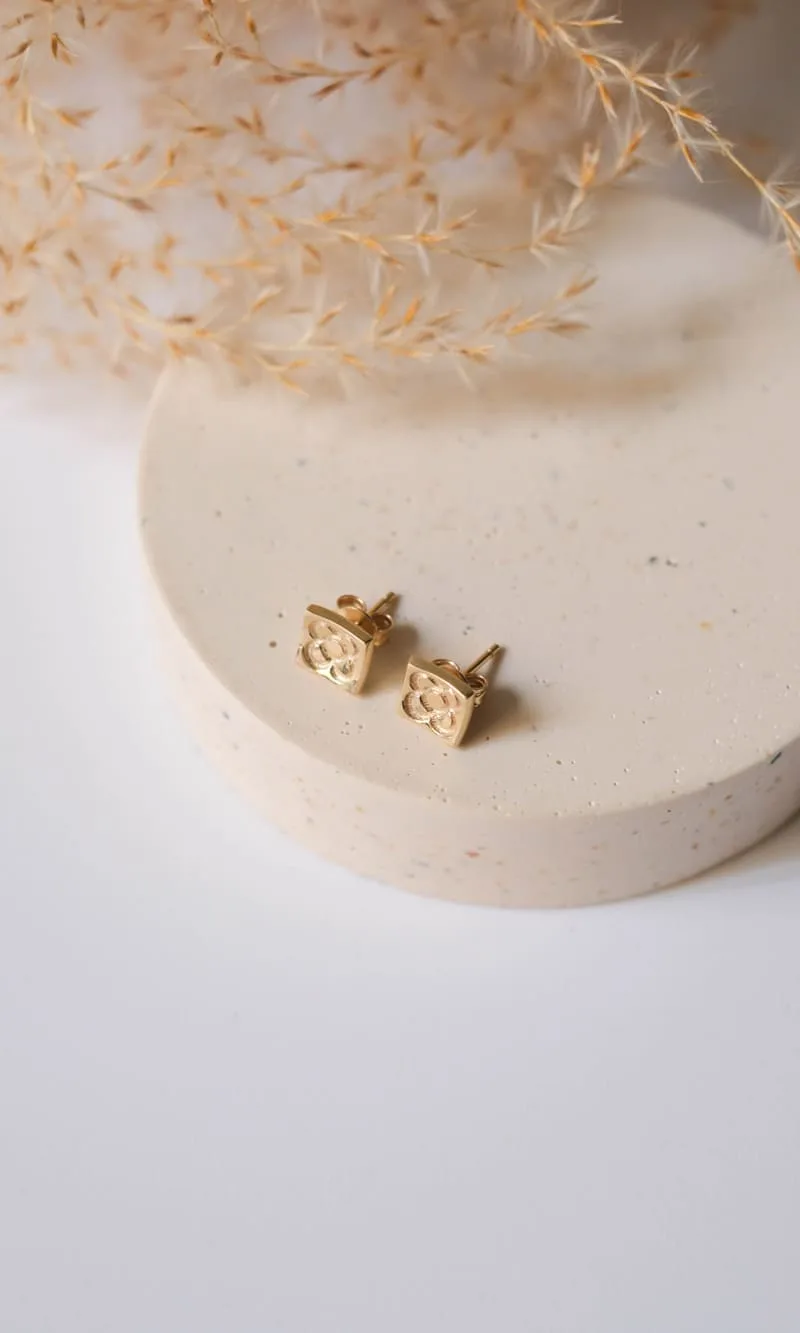 Arracades d’or de 9 k amb el motiu de la flor de la rajola de Barcelona. Mida: 0,8 cm.