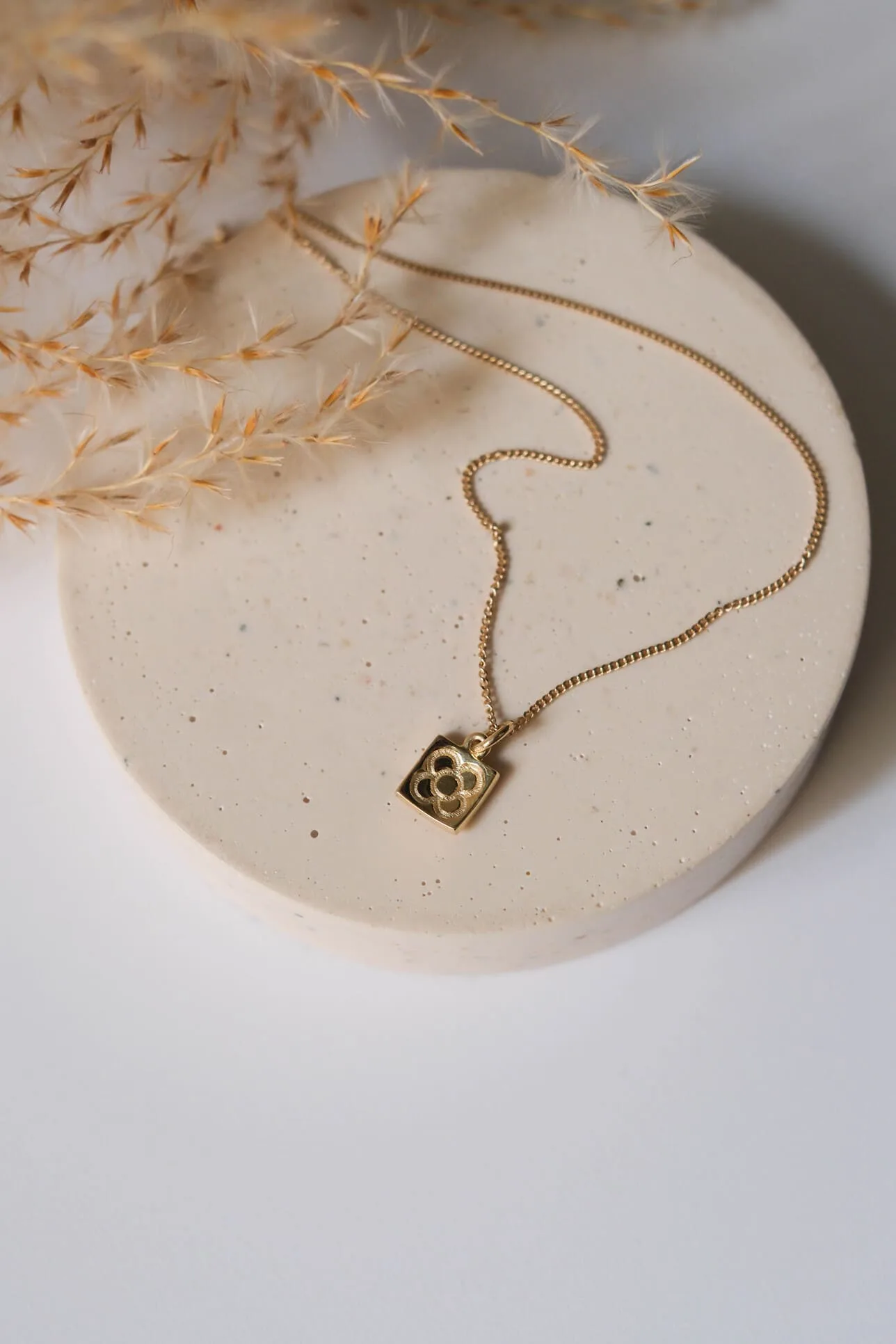 Penjoll amb cadena d’or de 9 k amb el motiu de la flor de la rajola de Barcelona. Mida: 0,8 cm.