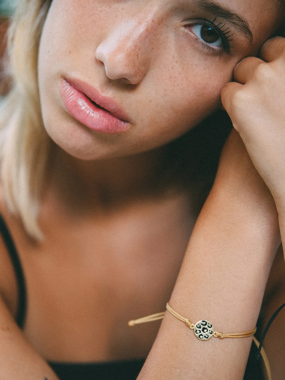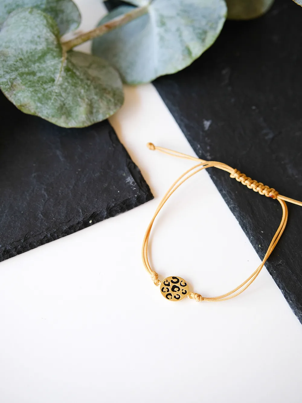 Pulsera de plata de ley 925 chapada en oro de 18 k y esmaltada con una placa con diseño de piel de leopardo. Medida 12 mm.