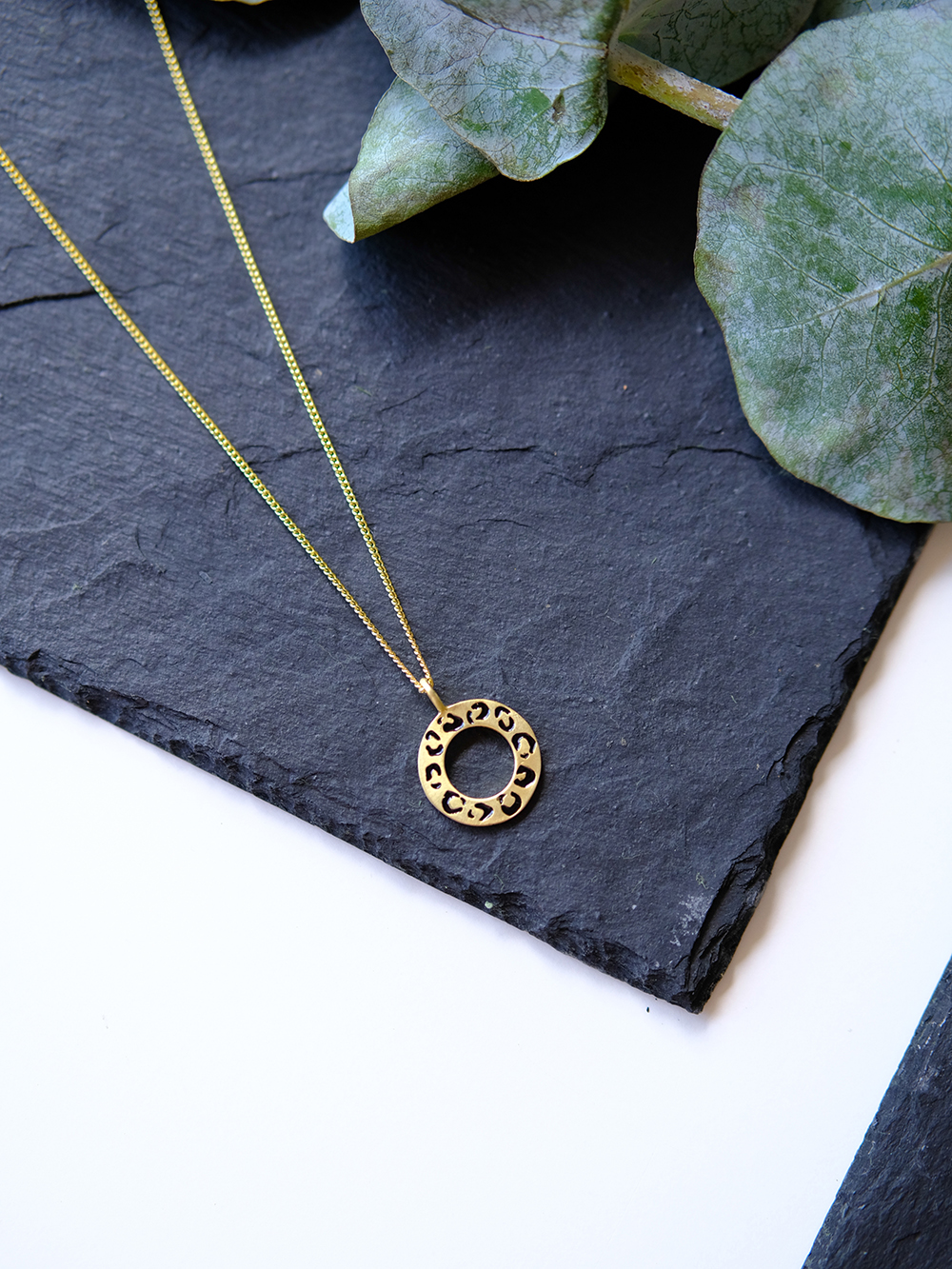 18 k gold plated sterling silver enameled pendant with a small circle and leopard skin design. Size: 0,59 inches.